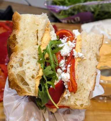 - Red chilli hummus, roasted red peppers, feta and rocket (vegan)