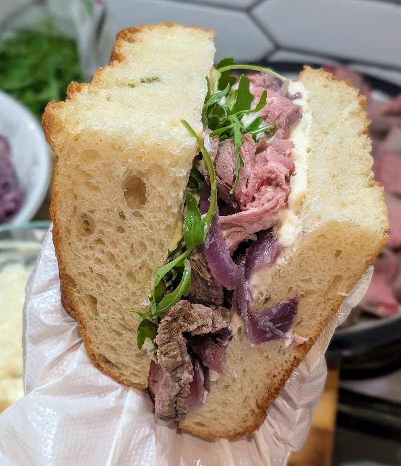 - Roast beef, caramelised onions, rocket and horseradish cream