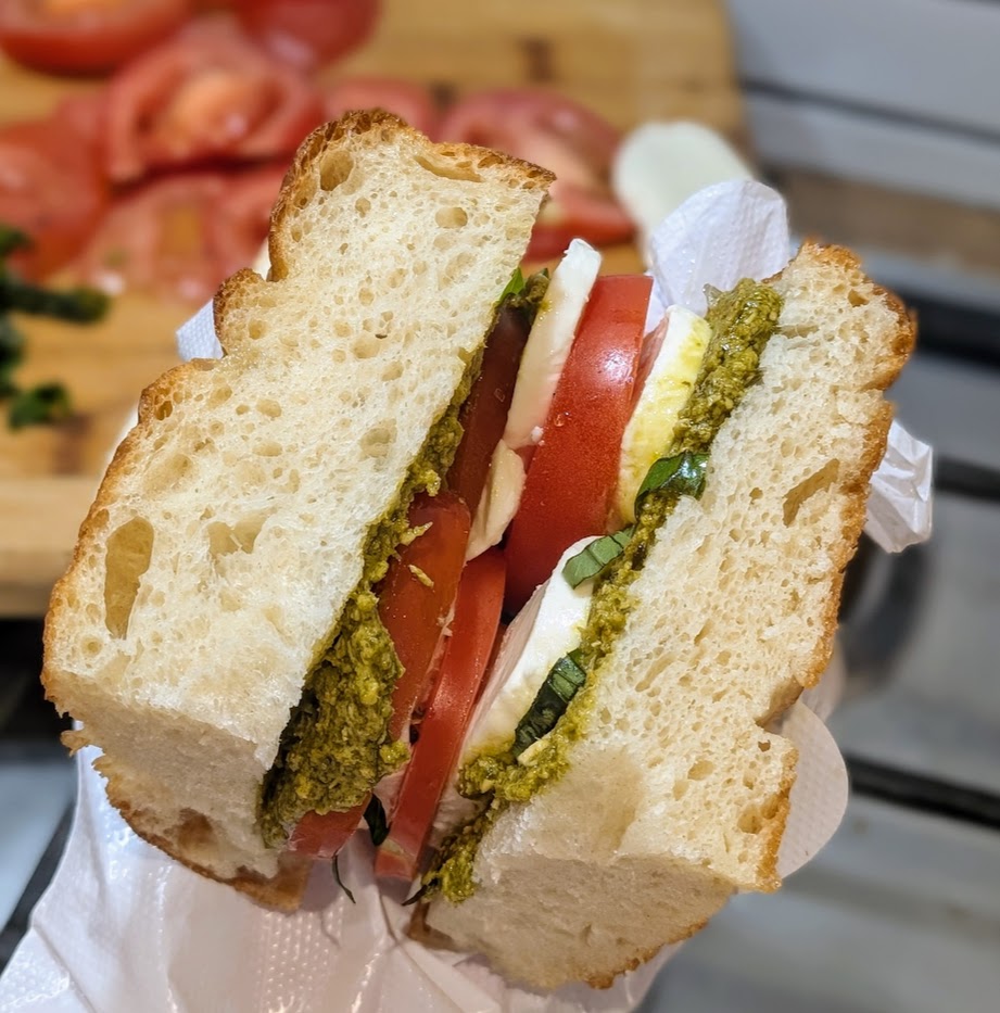 - Mozzarella, tomatoes, pesto and rocket (Veggie)